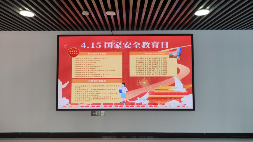 一是积极开展国家安全宣传教育活动。4 月上旬,公司通过大屏宣传、公众号和群内视频等宣传方式,向师生普及宣传国家安全、网络安全、公共卫生安全等内容,提高国家安全宣传教育的影响力和传播力,让全院师生深刻感受到国家安全和保密工作的重要性,增强了保密责任意识。