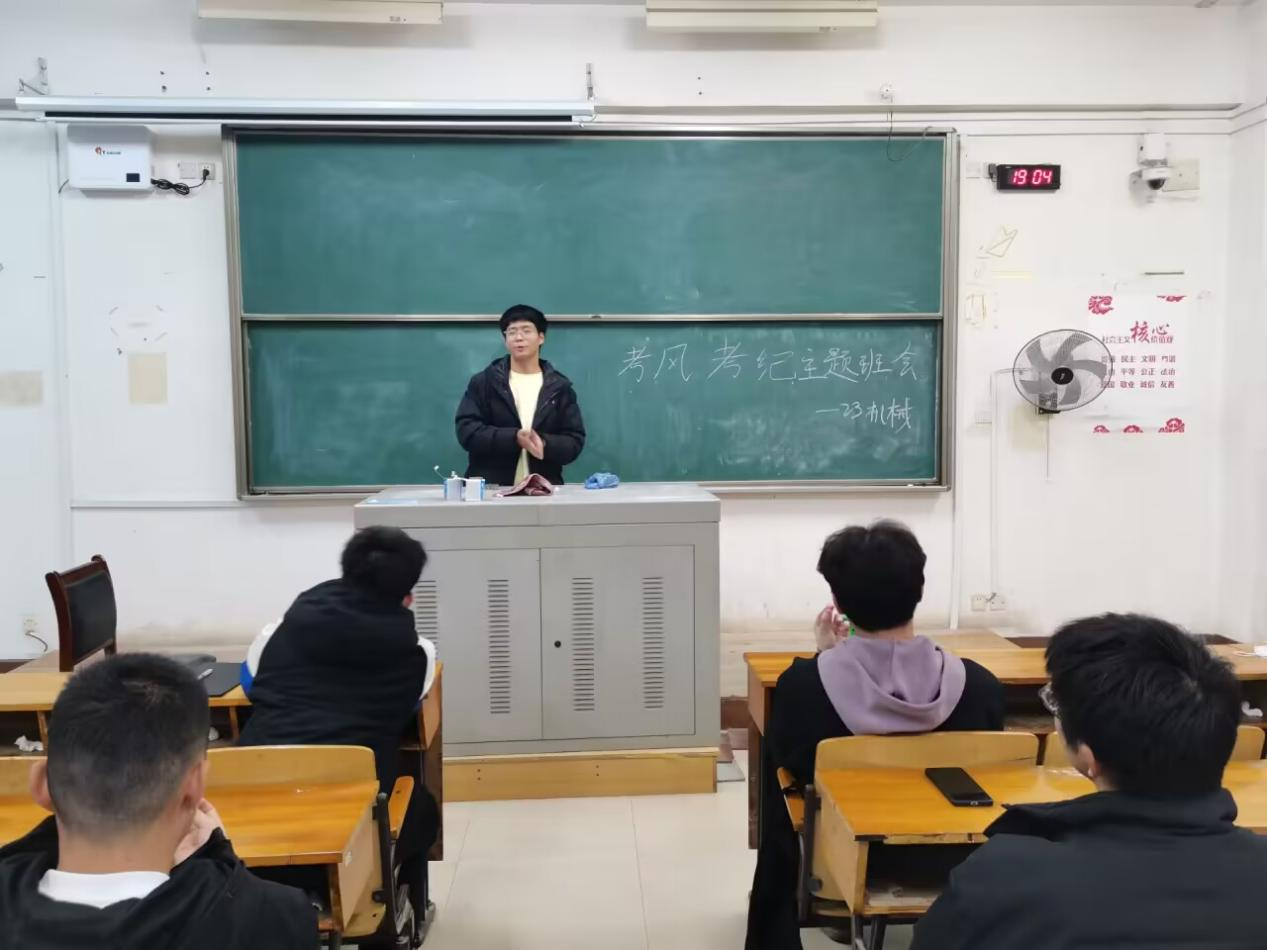 班会伊始,班级负责人提醒同学们,面对即将开始的期末考试,要树立端正的学习态度,认真复习,科学备考,用自己的努力去迎接考试。班会上,负责人带领全班同学学习考试相关法律法规,并列举了较多考试违规受罚的实际案例,告诫同学们端正考风、拒绝舞弊。号召同学们从自身做起,对舞弊行为积极检举,营造良好考试氛围。