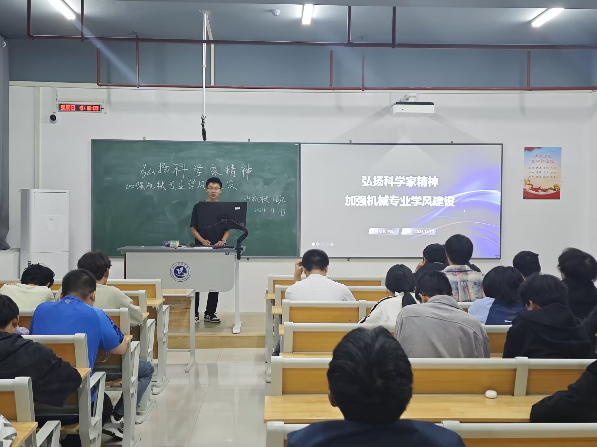 班会期间,同学们共同学习了“弘扬科学家精神,加强机械专业学风建设”的主题报告。报告阐述了科学家精神的核心价值,即以爱国主义为核心,强调科技工作者将个人发展与国家命运紧密相连。同时,报告还介绍了创新精神在机械领域的体现,奉献精神在机械行业的传承,以及协同精神在机械专业团队合作中的重要性。