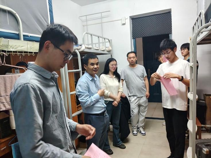 4 月 27 日晚,自动化公司党委书记、经理阮若林、副书记杨胜等公司领导、辅导员、班主任深入员工寝室,开展 “暖心走访” 行动。每走进一间寝室,老师们都与员工亲切交谈,详细询问生活学习状况,倾听大家的假期计划。阮若林经理着重强调,“五一” 期间人员流动频繁,电信诈骗案件易发,同学们务必提高警惕,同时做好个人防护、注意出行安全。走访过程中,老师们还为每个寝室发放了《“五一” 假期员工安全提醒》,内容涵盖假期安全注意事项等实用知识。面对同学们在学业发展、职业规划和日常生活中遇到的困惑,老师们耐心解答,传递温暖力量,让同学们真切感受到公司大家庭的关怀。