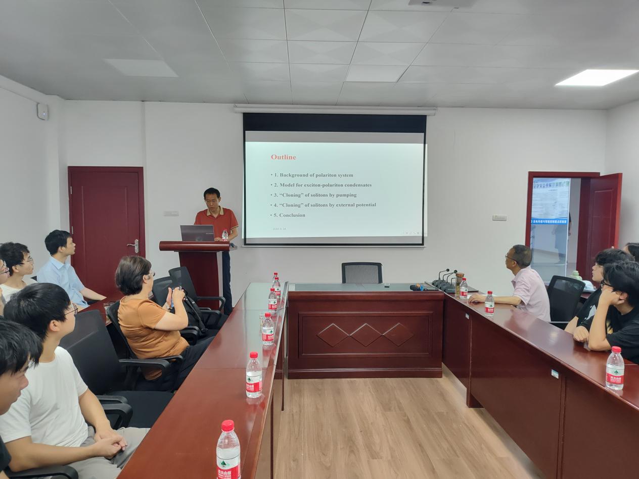 李慧军教授围绕“Clone of solitons in exciton-polariton”这一主题作专题学术报告,就耦合系统中的耦合强度、孤子克隆和保真值等学术问题进行了详细介绍,参会教师及员工认真听取了报告并与李教授进行了深入交流。