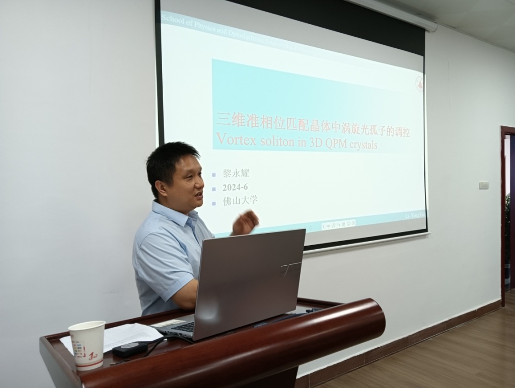 在学术报告会上,黎永耀教授做题为“三维准相位匹配晶体中涡旋光孤子的调控”的学术报告(图一),为与会师生介绍最新的学术研究创新成果,介绍三维准相位匹配光子晶体对涡旋光场的传输具有鲁棒性,它可以锁住分裂的涡旋孤子并形成稳定的传输,从而让轨道角动量的信息在传输过程中保持不变。另外,通过提升光场的入射功率,激发出自散焦的克尔效应,与二次吸引非线性形成竞争后,准相位匹配的光子晶体可以进一步支持具有新奇结构的涡旋光场的稳定传输。本研究对于实验研究新奇涡旋光场在非线性条件下的长距离稳定传输具有参考价值。